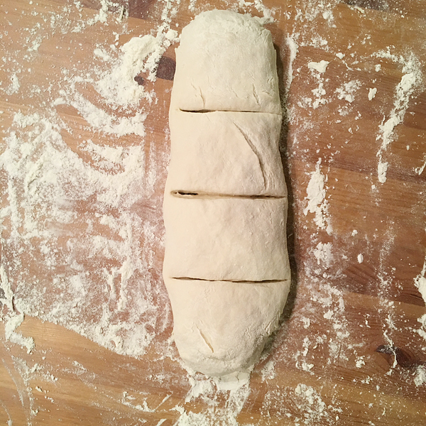 Нужно это для того, чтобы разделить тесто на одинаковые куски. Я делю на 4. Режем.